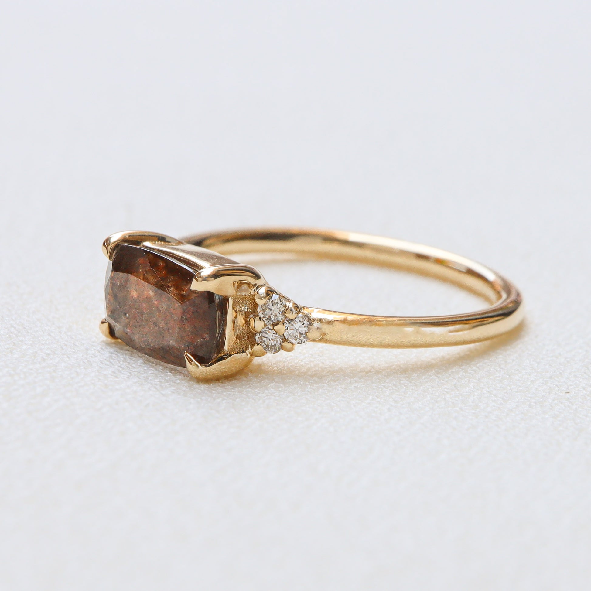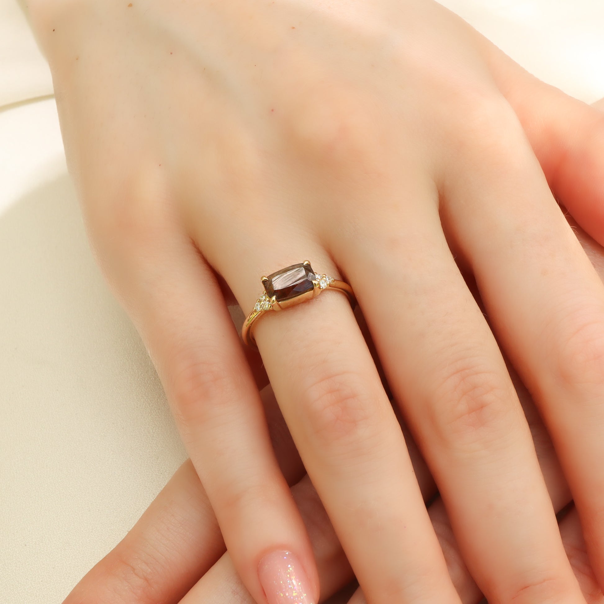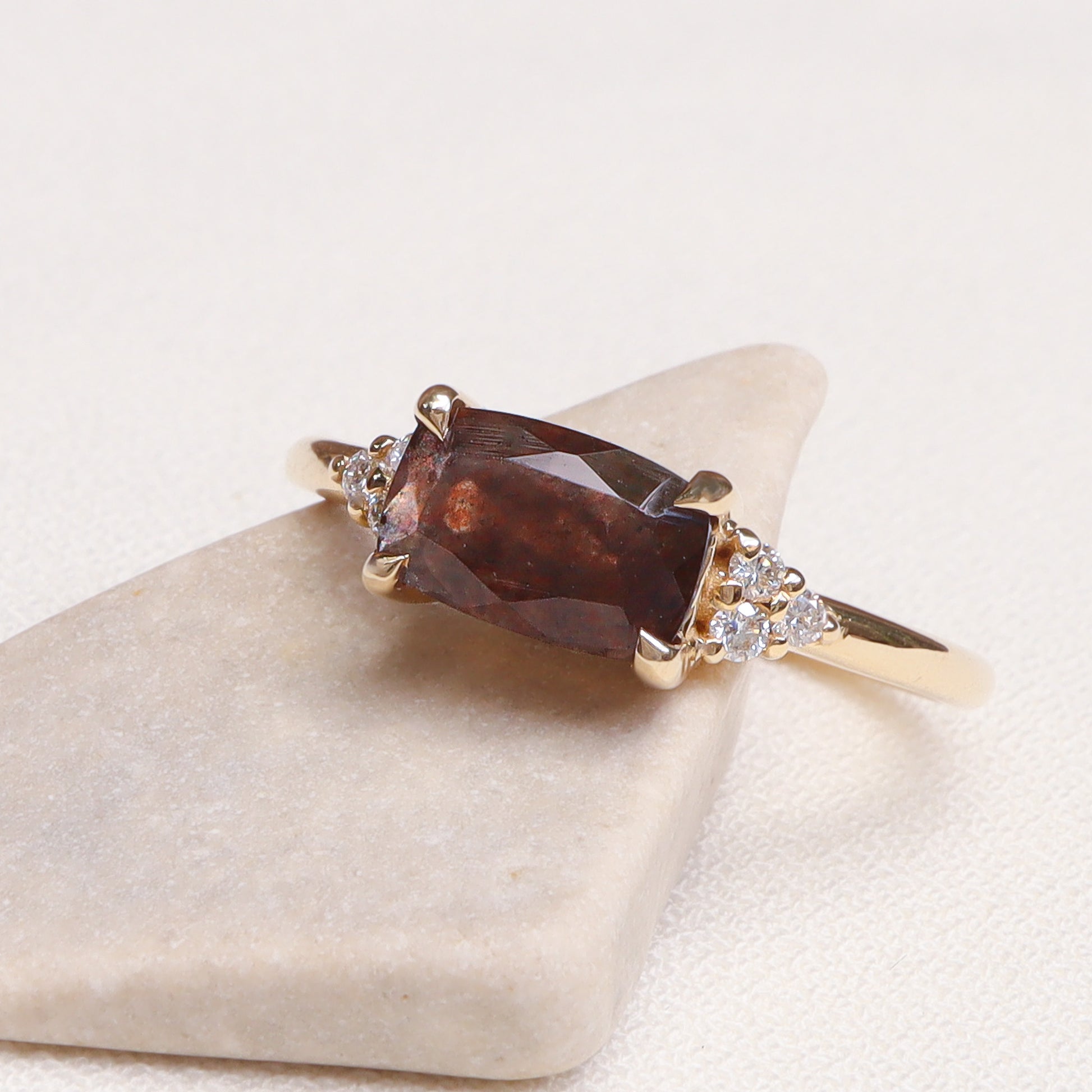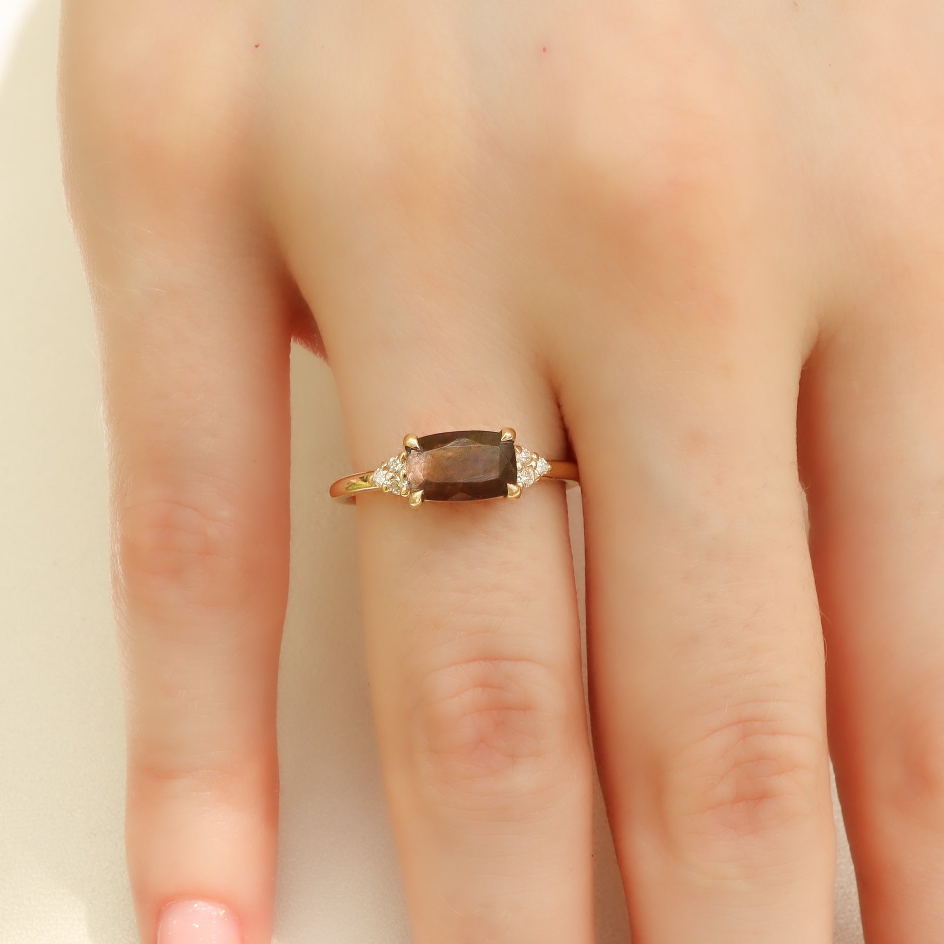 האבן המרכזית משובצת על גבי טבעת זהב צהוב ומלווה בשלושה יהלומים לבנים קטנים בכל צד, שמוסיפים ברק עדין ומאוזן. הטבעת מושלמת למי שמחפשת תכשיט שמשלב בין טבעיות, עומק ואסתטיקה ייחודית, ומתאימה ליום יום וגם לרגעים מיוחדים.
