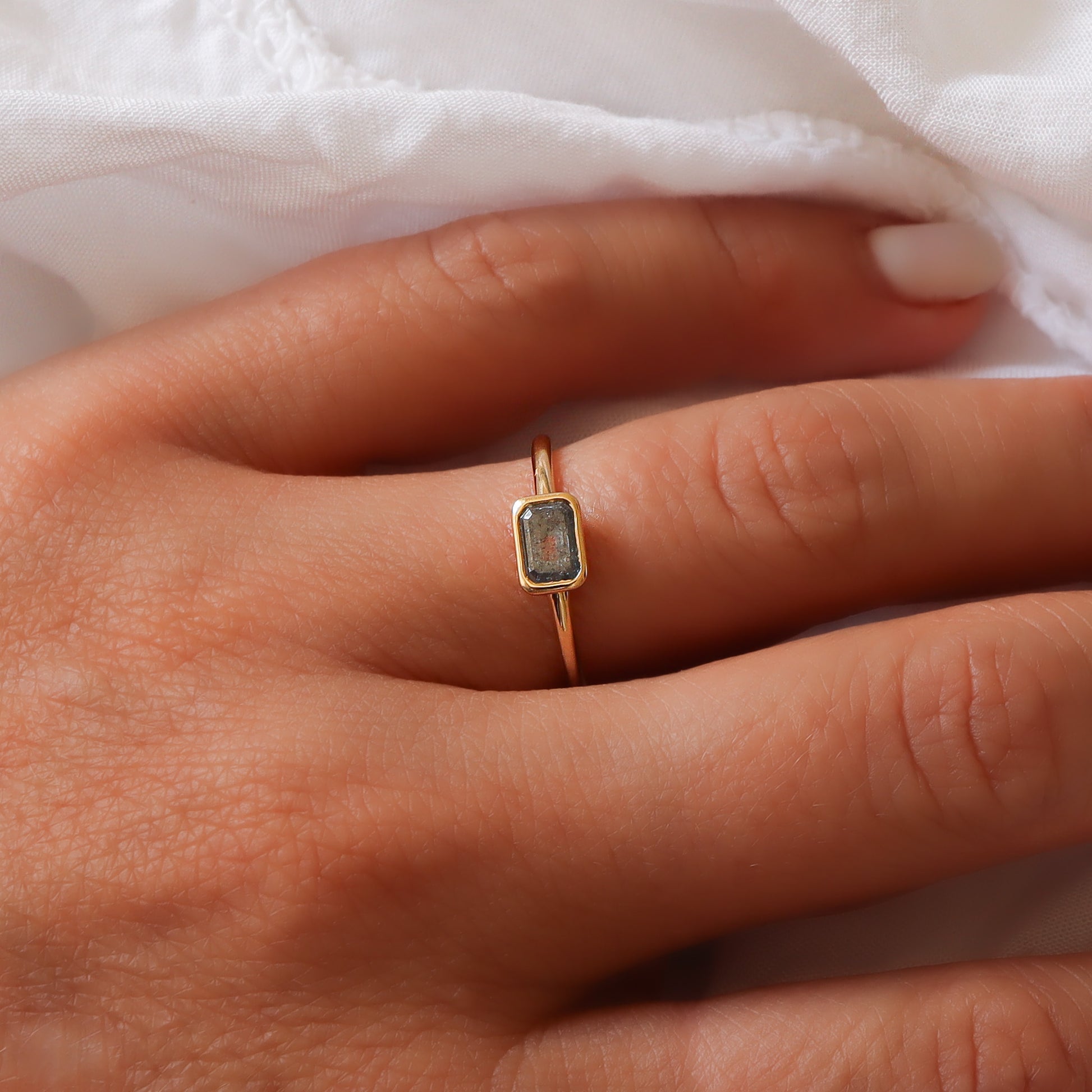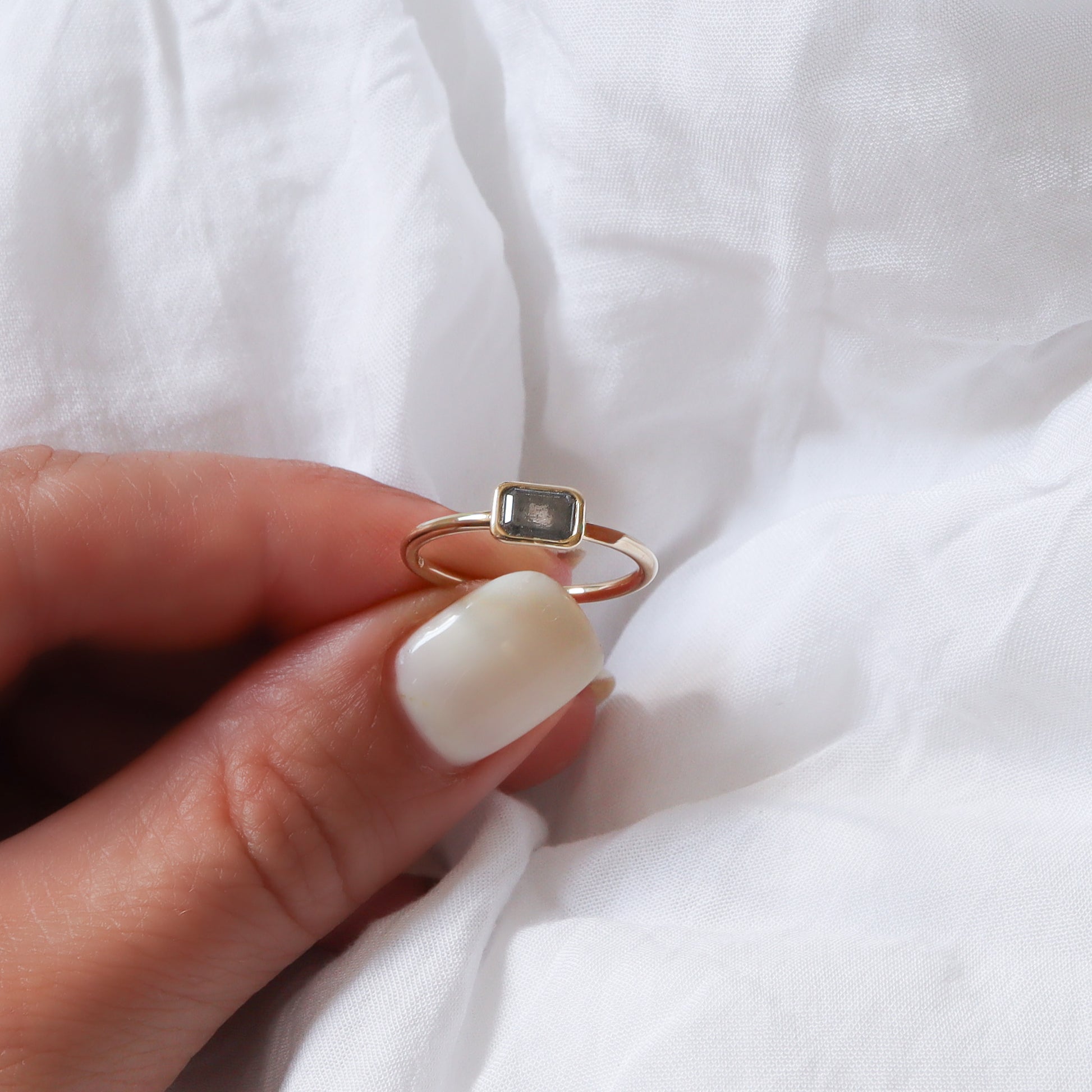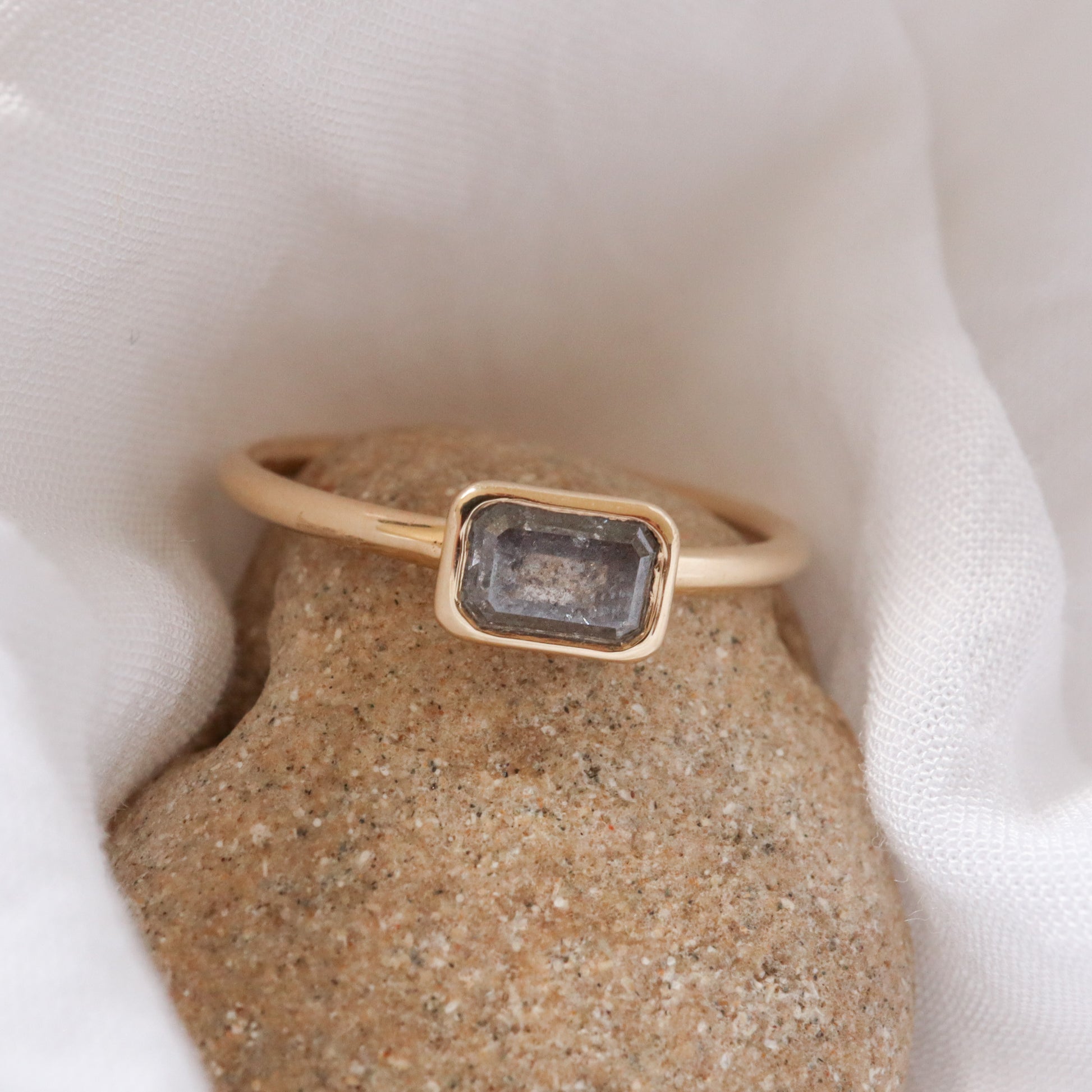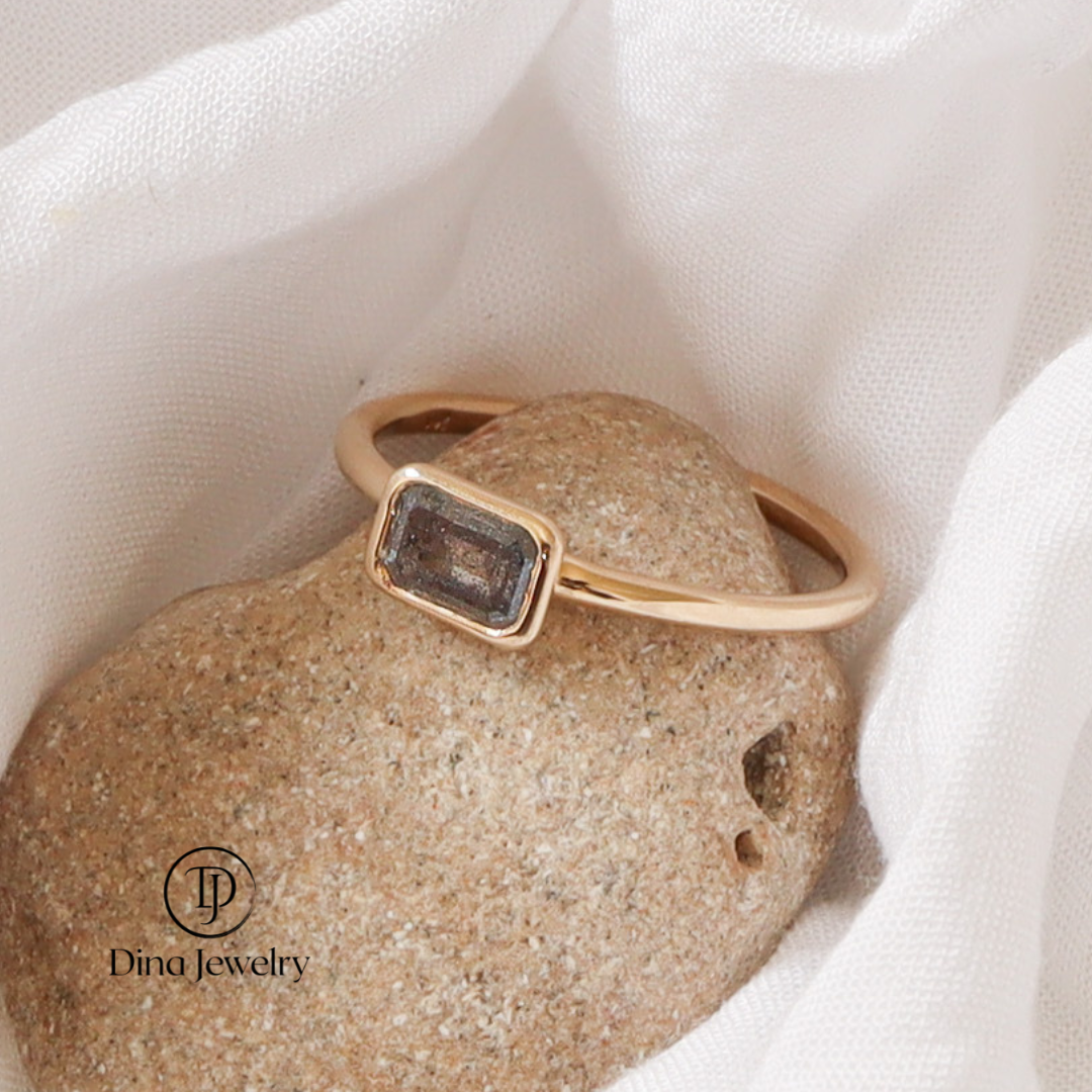 טבעת עדינה ומלאת אופי, עם יהלום סולט פפר בחיתוך אמרלד ייחודי, משובץ בשיבוץ בזל זהוב. היהלום האפור-שחור מספר סיפור של יופי לא שגרתי, ומביא איתו עומק, אישיות ואמירה. שילוב של עידון עם נוכחות - מושלם ליום-יום או כטבעת אירוסין למי שמחפשת משהו לא צפוי.