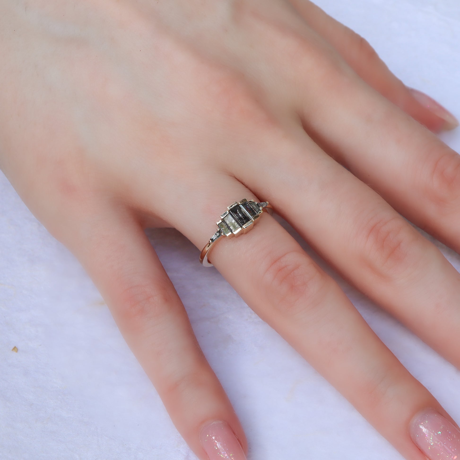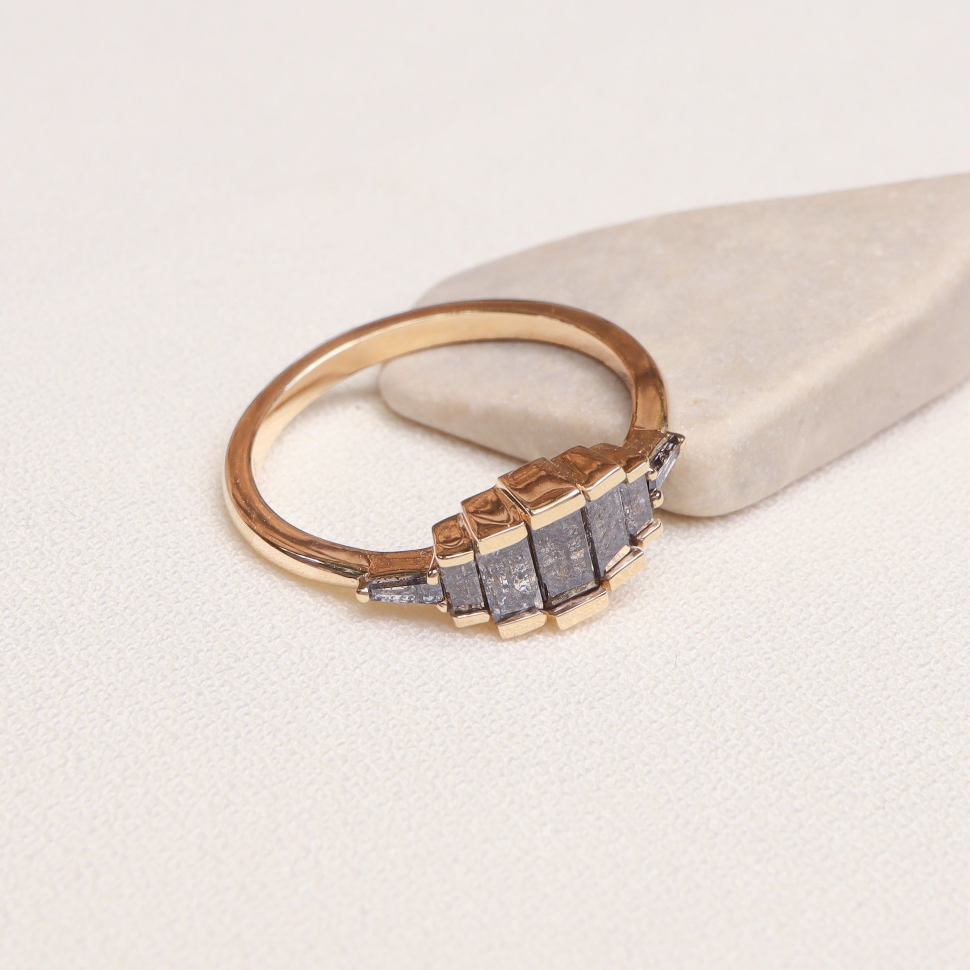 האבנים משובצות בתוך חצי מסגרת זהב צהוב, היוצרת מראה מדורג שמעניק לטבעת עומק גיאומטרי ונוכחות יוצאת דופן. שילוב הגוונים האפורים עם חום הזהב יוצר איזון עדין בין מודרניות לטבעיות.