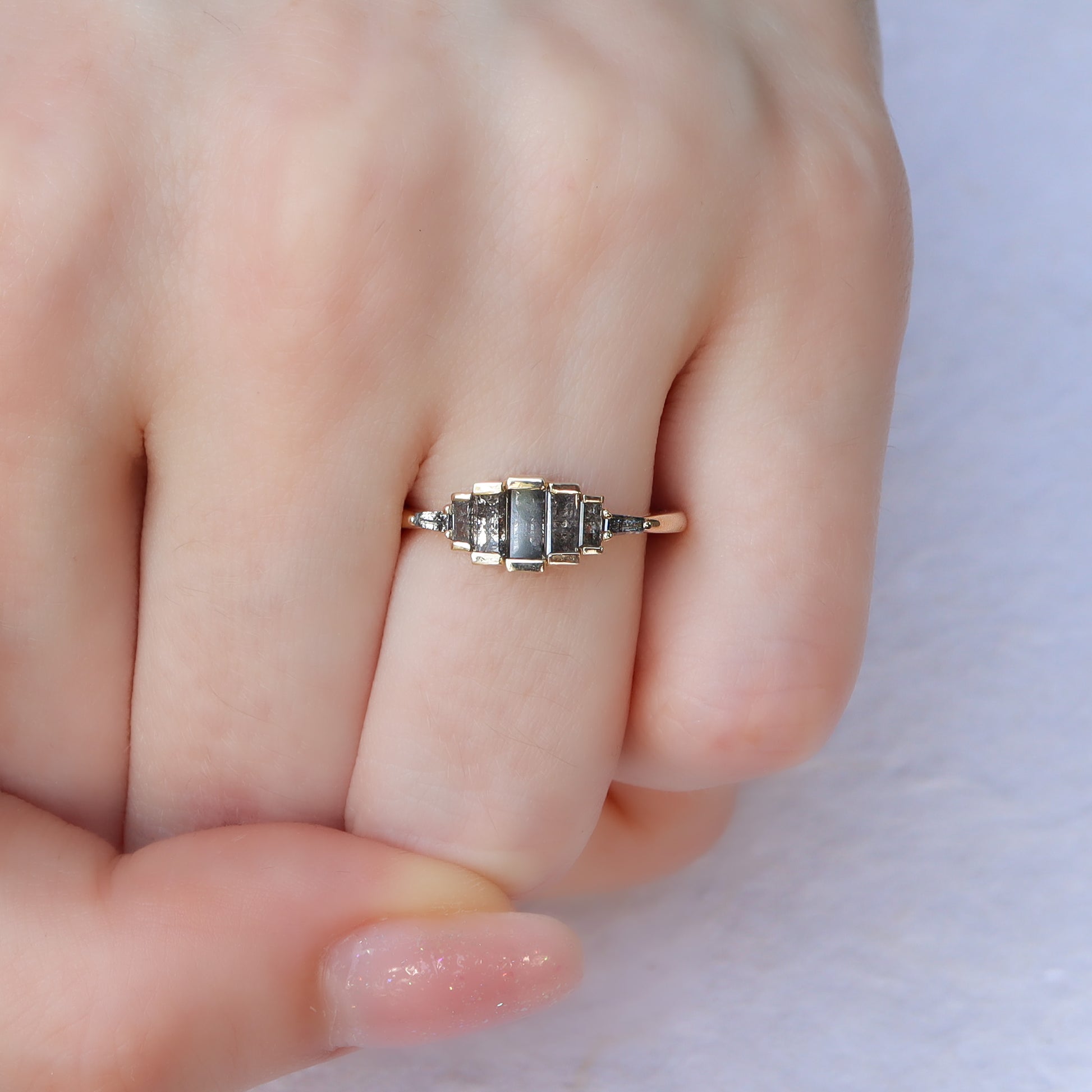 טבעת יהלומי באגט "Salt & Pepper" בעיצוב מרהיב וייחודי, המשלב חמישה יהלומי באגט אפורים עם שני יהלומי טרפז קטנים משני הצדדים.