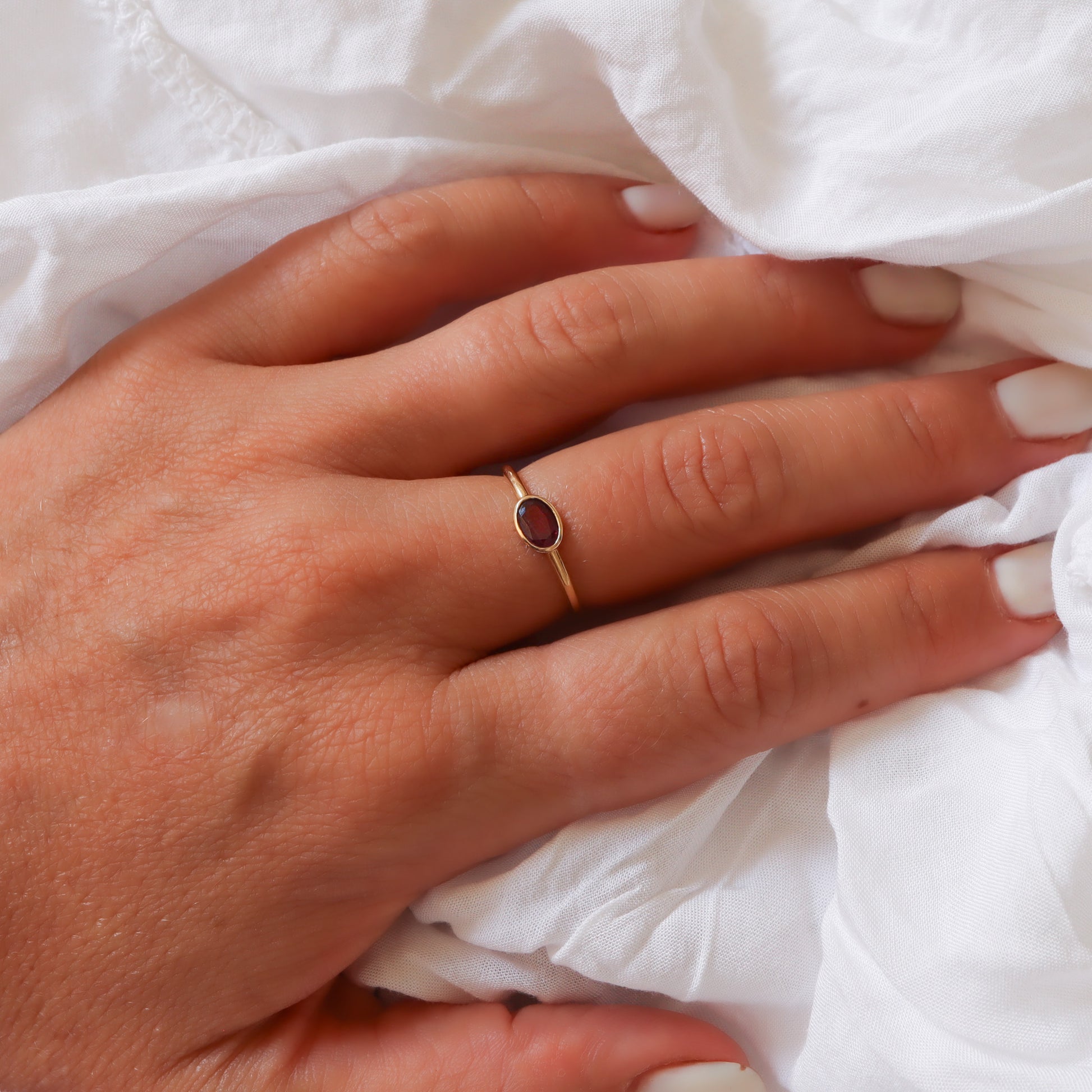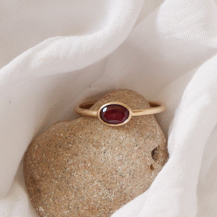 טבעת עדינה ומלאת נוכחות עם רובי אדום בשיבוץ בזל חלק, בעלת צורה אובלית טבעית שמבליטה את גוון האבן העמוק והחם. הרובי ידועה כאבן של תשוקה, אהבה ועוצמה פנימית - מתאימה במיוחד למי שמחפשות תכשיט עם משמעות רגשית עמוקה. היא גם אבן הלידה של חודש יולי, ונחשבת כמחזקת ביטחון עצמי ואומץ.
