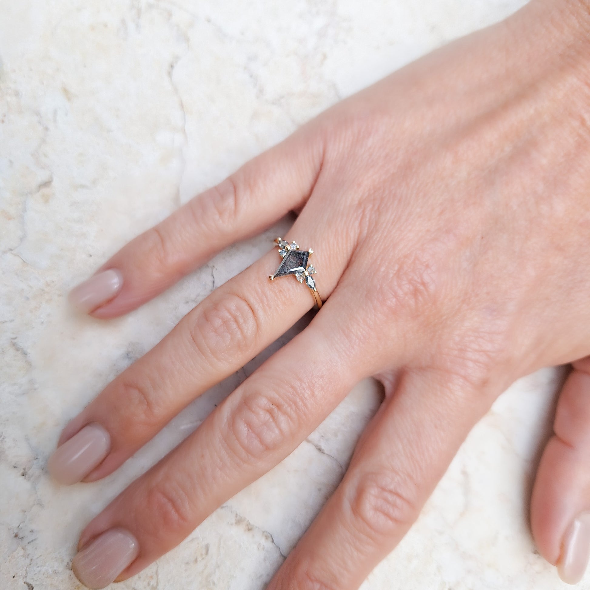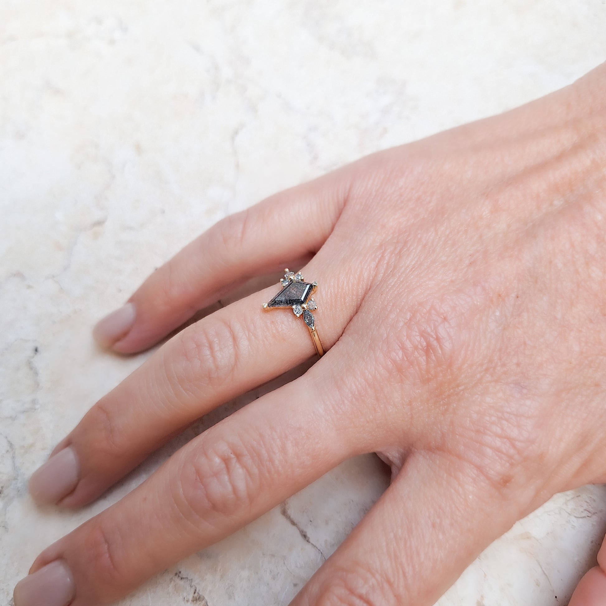 משני צדי האבן המרכזית משובץ מקבץ יהלומים הכולל יהלום בחיתוך מרקיזה ושני יהלומים בחיתוך עגול. שילוב הצורות יוצר מבנה דמוי עלי כותרת המעניק לטבעת רכות ונוכחות מרשימה על האצבע. כל היהלומים הם יהלומי מלח-פלפל בגוונים אפורים התואמים לאבן המרכזית. האבן המרכזית משובצת בשיבוץ כוס (בזל) המגן על קצוותיה, בעוד אבני הצד משובצות בשיבוץ שיניים עדין.