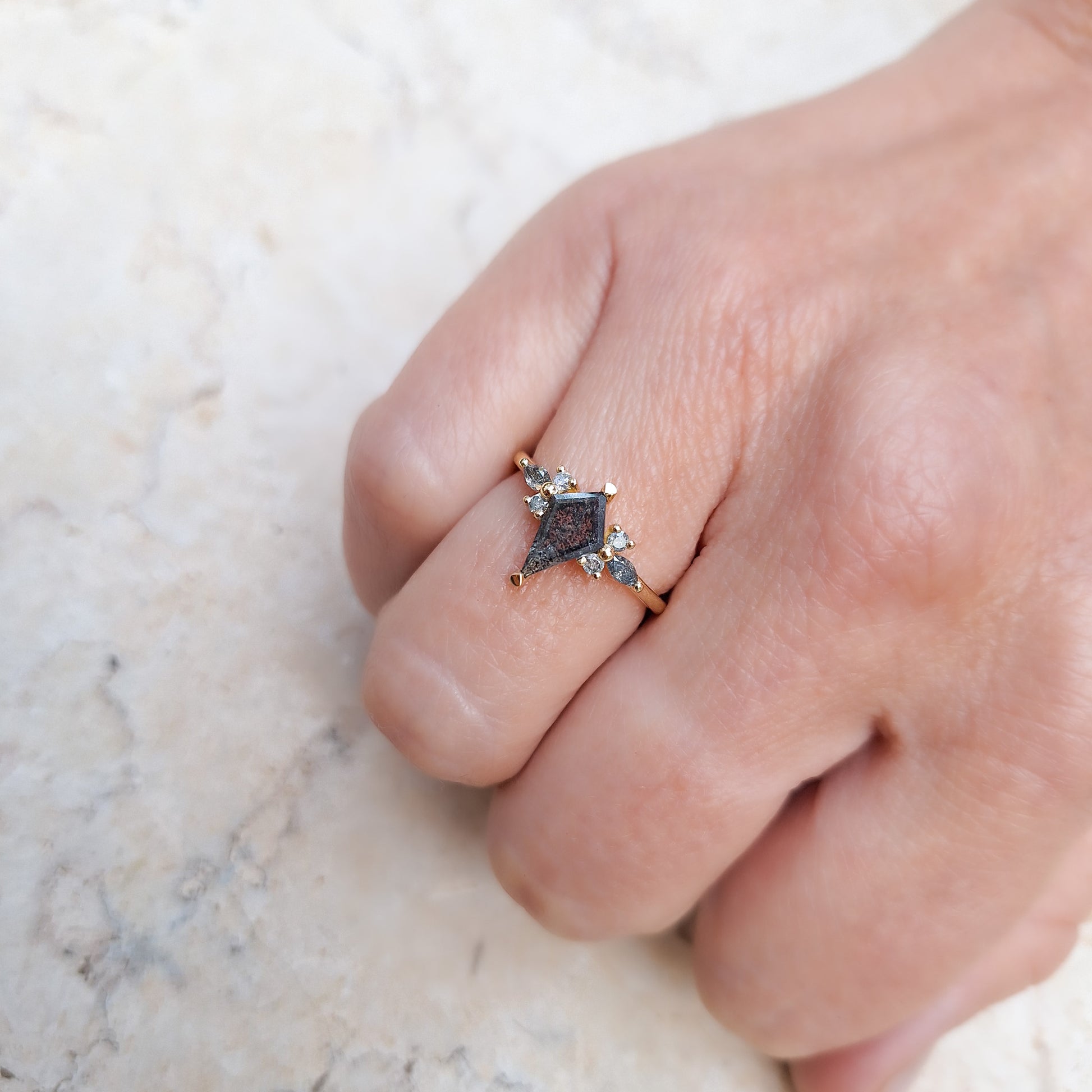 טבעת בעלת מראה אורגני וייחודי, המשלבת זהב צהוב 14 קראט עם סידור יהלומים היוצר אפקט פרחוני עדין. במרכז הטבעת משובץ יהלום מלח-פלפל טבעי בחיתוך דלתון בגוון אפור כהה ועמוק.