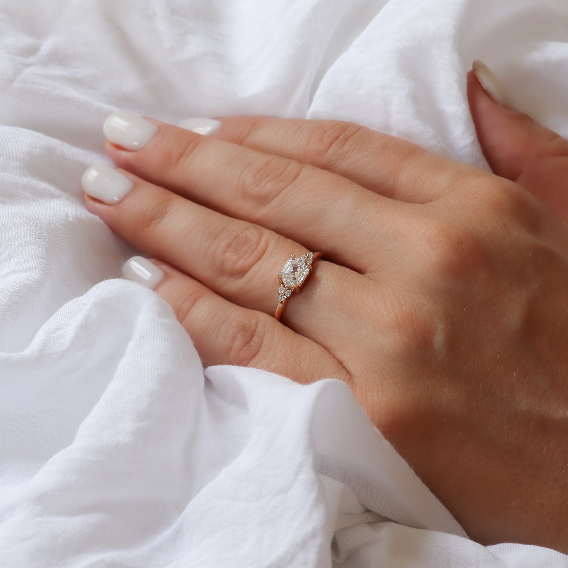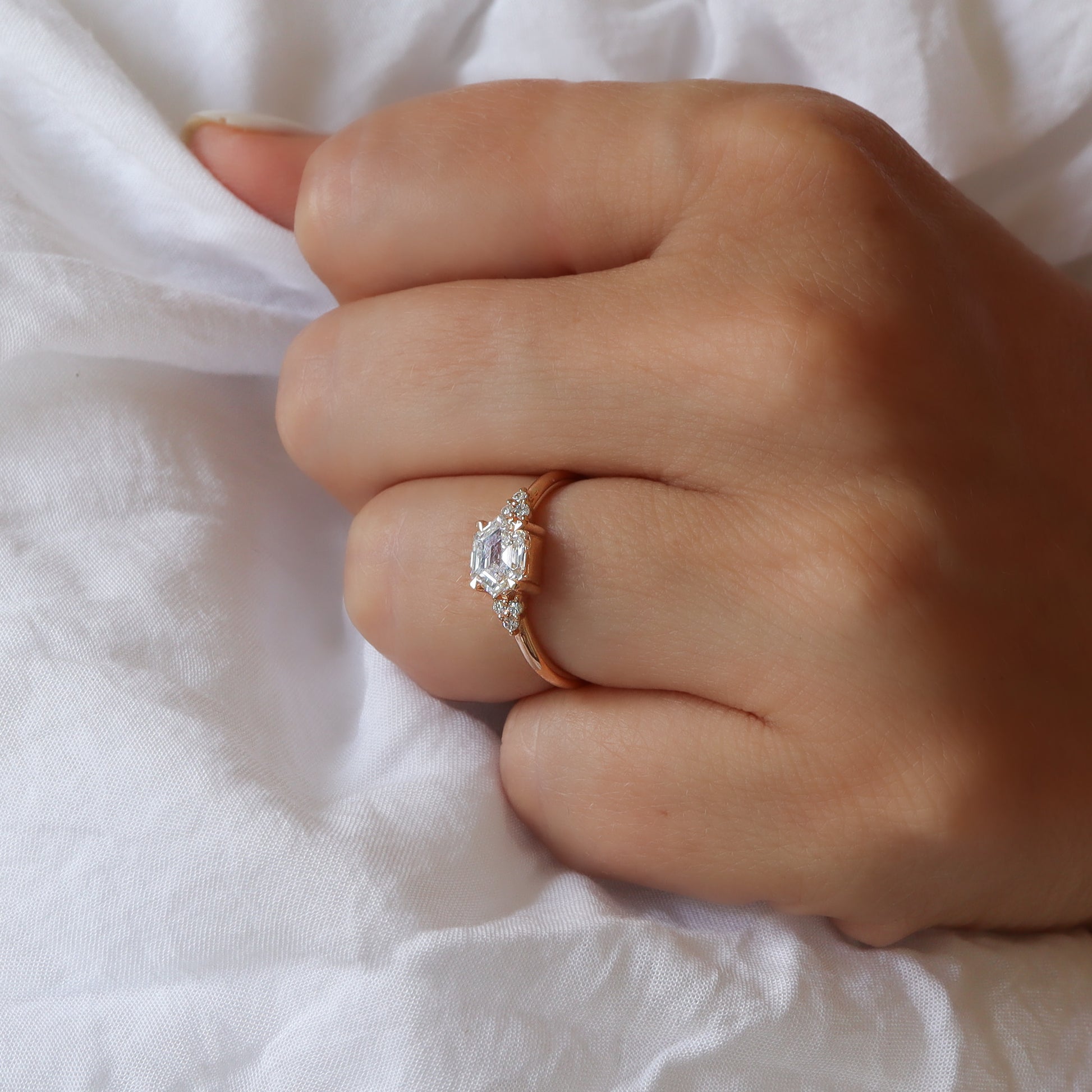 טבעת אירוסין מיוחדת עם טוויסט - יהלום משושה במרכז, משובץ לרוחב ליצירת מראה ייחודי ולא שגרתי. מכל צד מלווים אותו שלושה יהלומים עגולים שמוסיפים ברק ועדינות. עשויה מזהב אדום שמחמיא לגוון היהלומים ומעניק חמימות ורוך. טבעת שהיא גם אלגנטית, גם נועזת - פשוט אחרת.