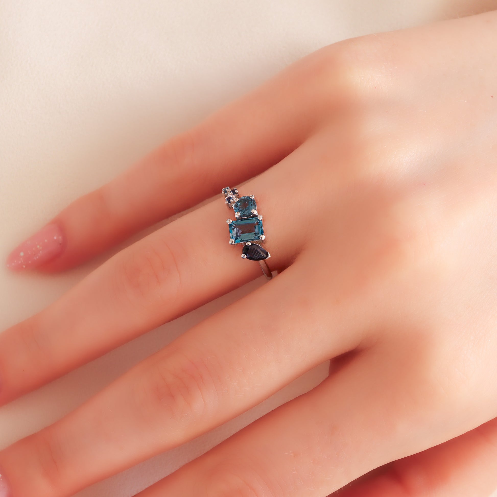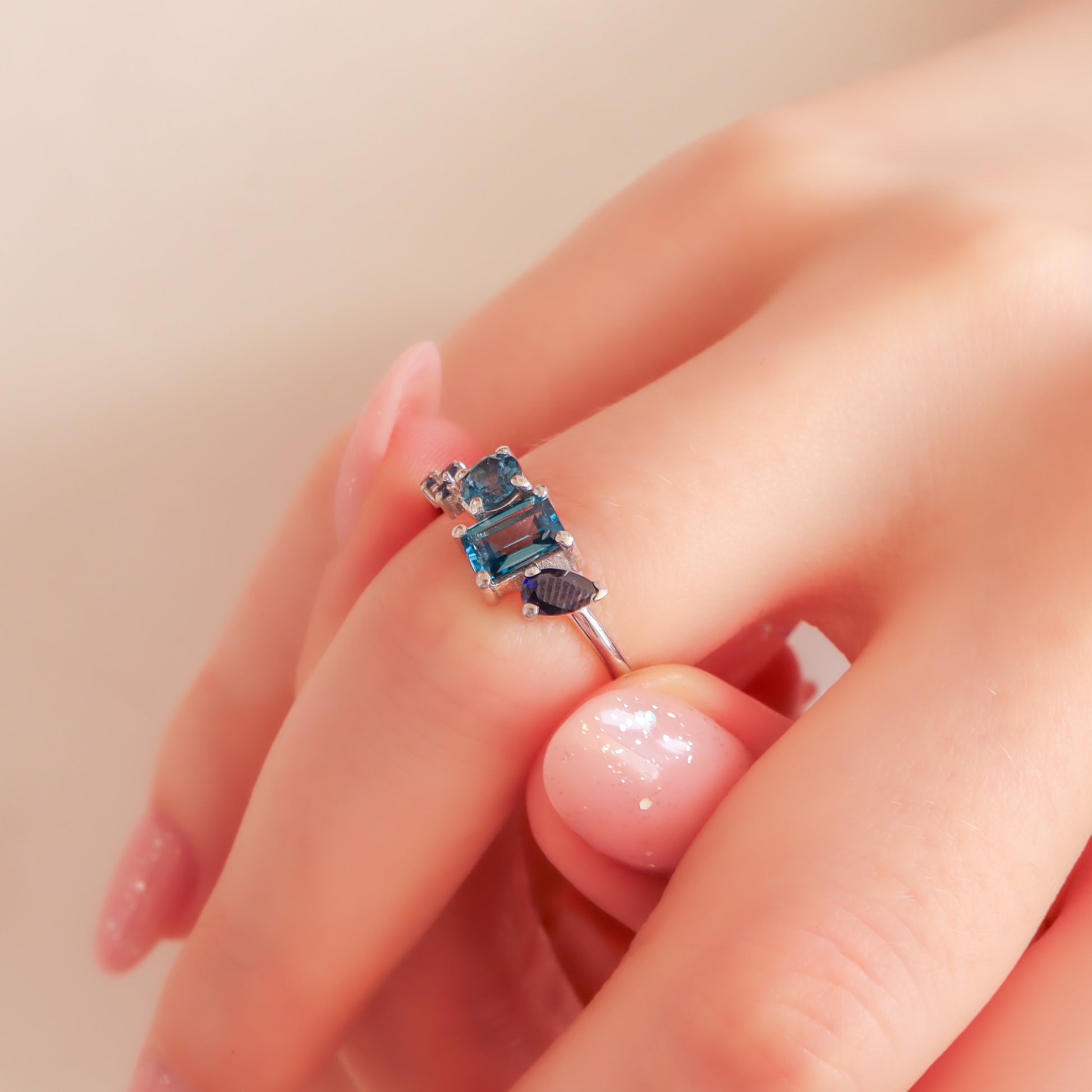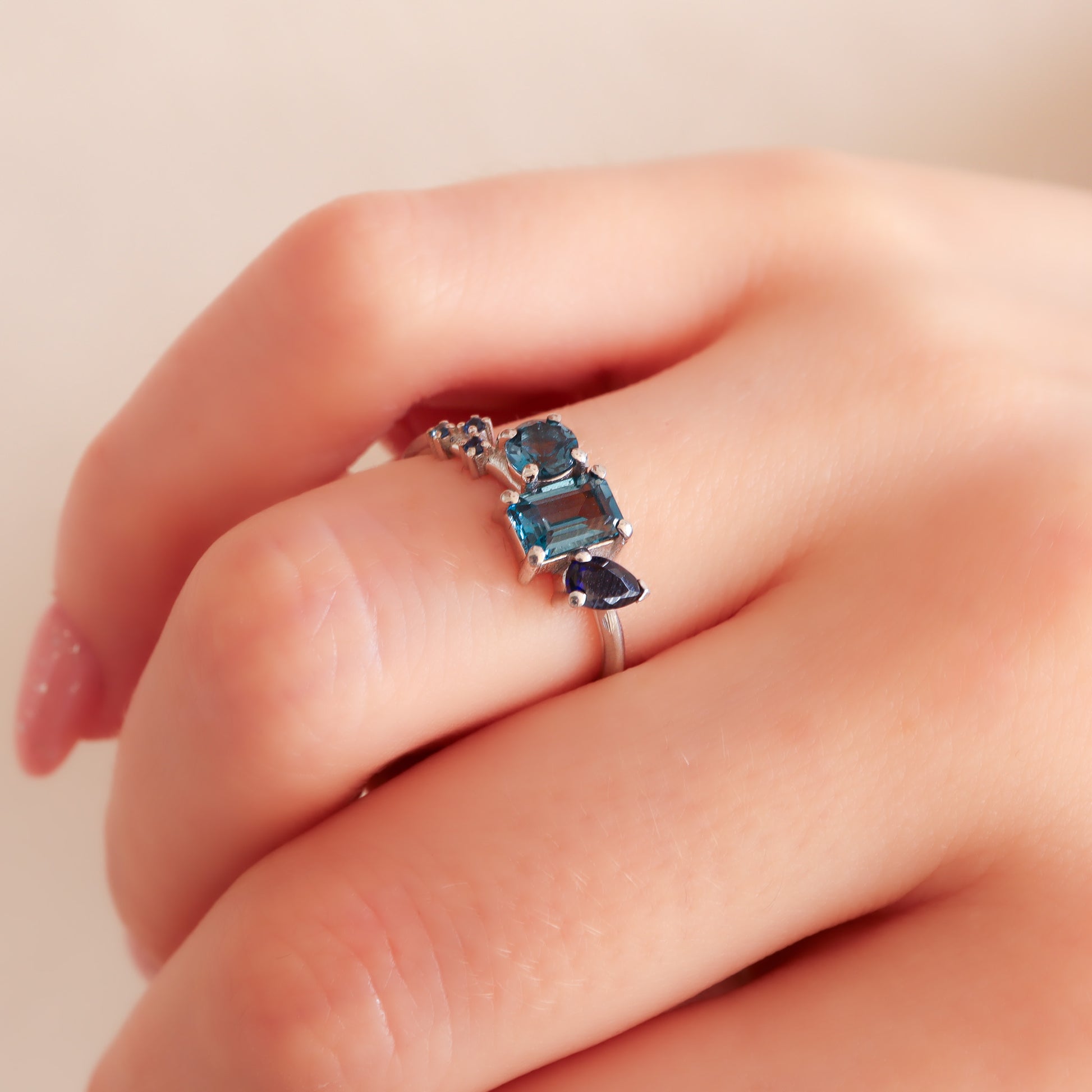 טבעת זהב לבן המורכבת משישה אבני חן כחולות בצורות שונות. האבנים מסודרות באופן אסימטרי, יוצרות משחק מרתק של גוונים כחולים בין אבני הספיר והטופז. השילוב הייחודי של הצבעים והצורות מעניק לטבעת מראה אלגנטי ונועז, כאילו שוקעת במי עומק אפלוליים. הטבעת מקרינה תחושה של עוצמה וסוד, ותשדרג כל לוק.