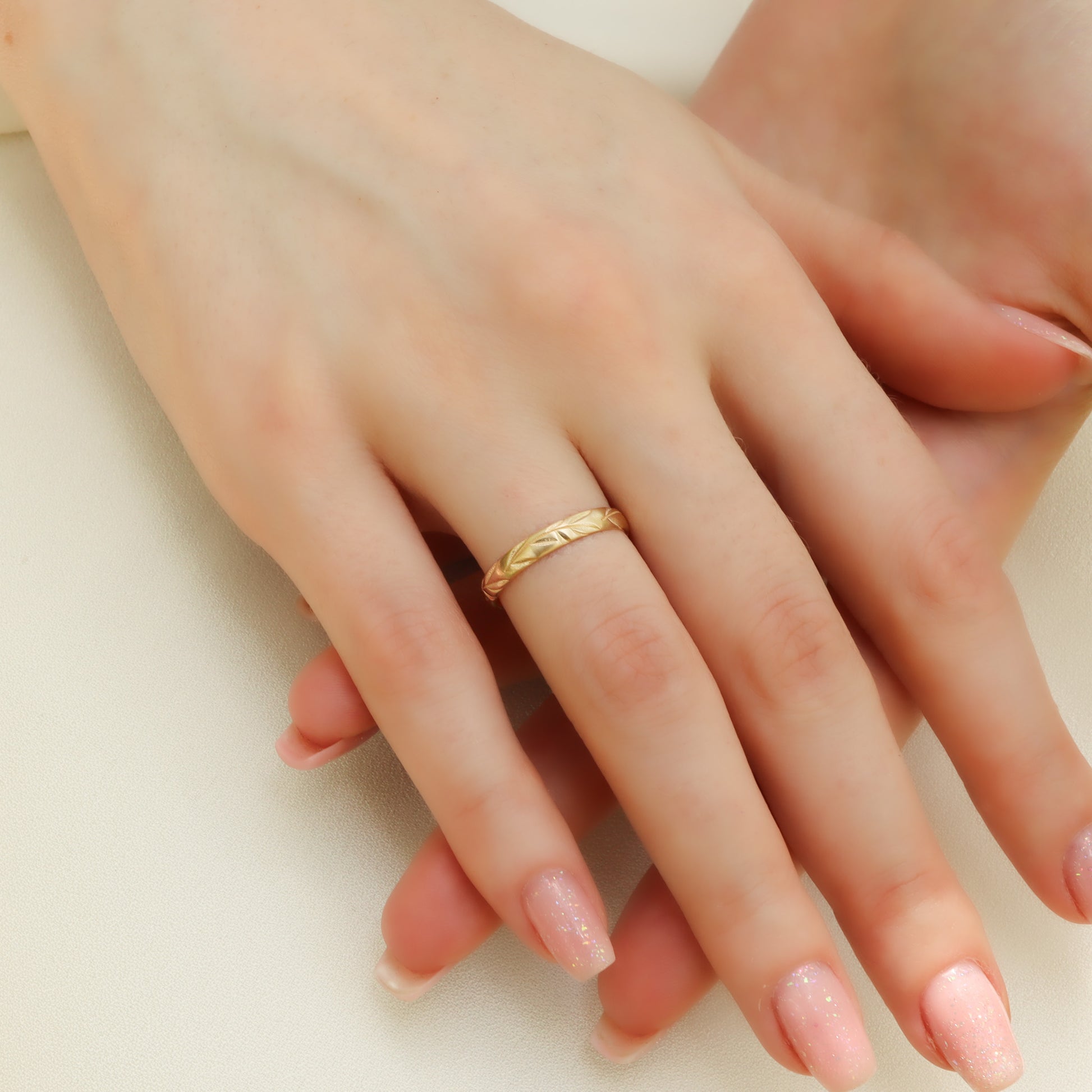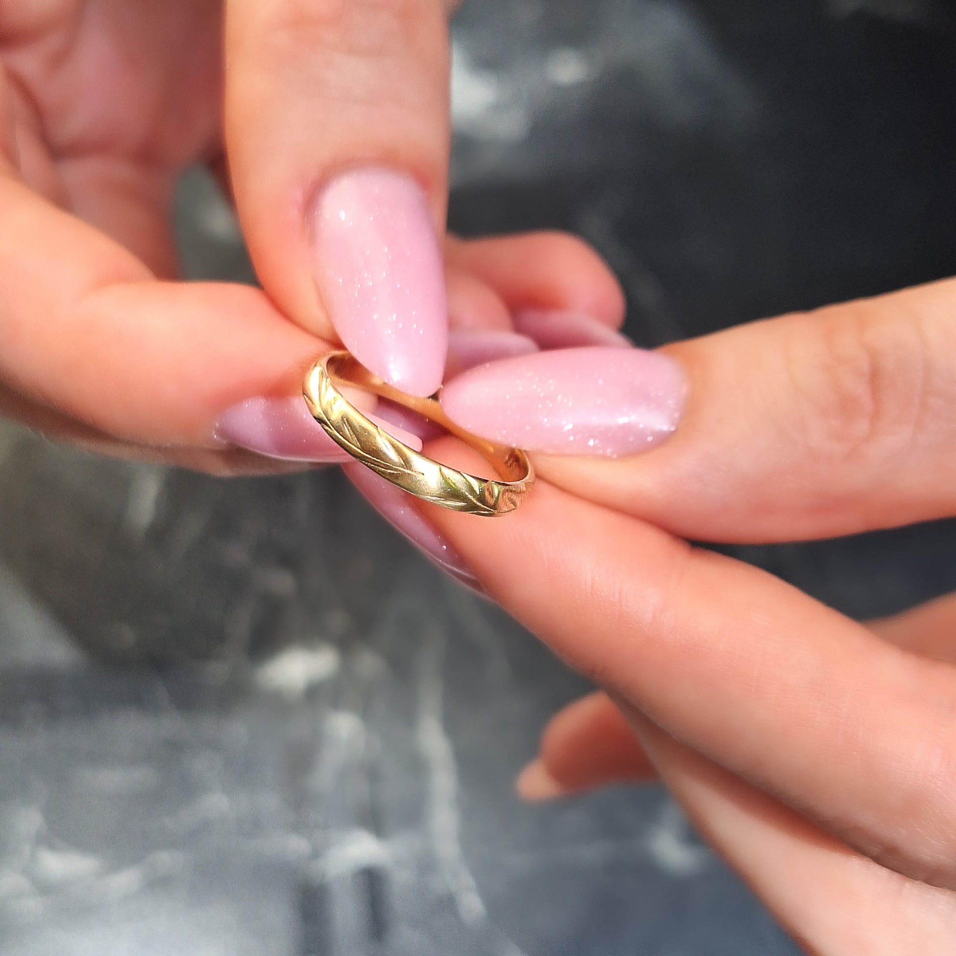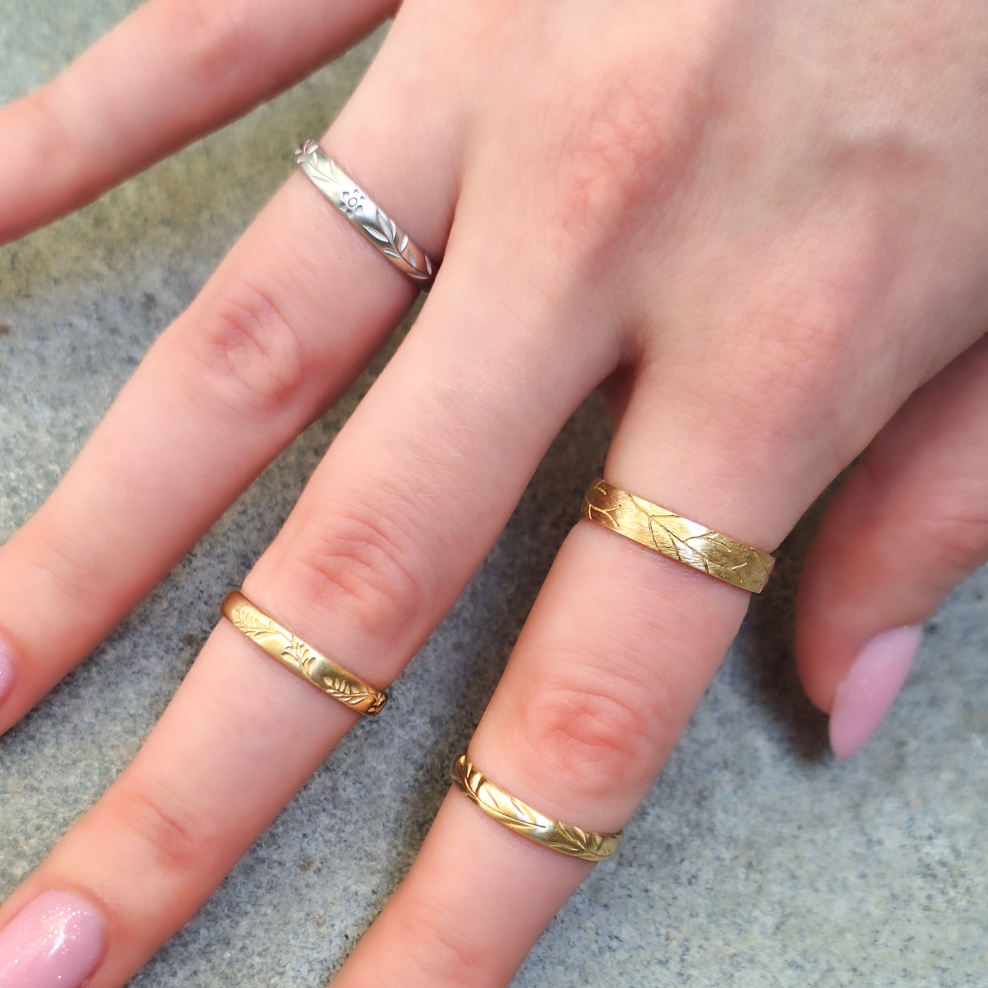 טבעת נישואים בהשראת הטבע, עם חריטת עלים עדינה. העלים מסמלים צמיחה, שורשיות והתחדשות, בדיוק כמו הקשר שבני זוג בונים יחד לאורך השנים. כל עלה בטבעת מעוצב בקפידה ומעניק לטבעת מראה טבעי, מלא חיים ורגש.