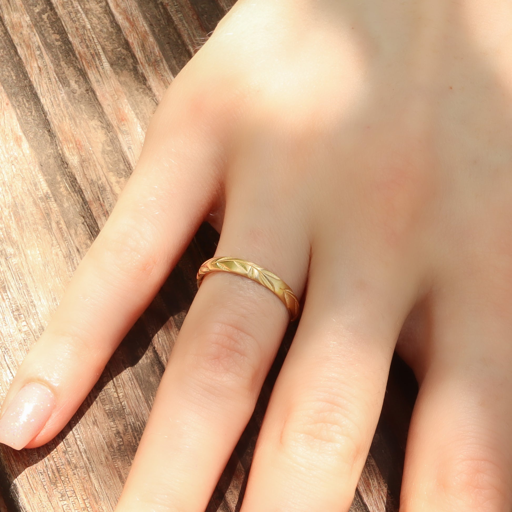 הטבעת עשויה מזהב בגימור מט, ומשדרת שילוב בין פשטות אלגנטית ליופי על זמני. היא מושלמת למי שמחפשת טבעת נישואין ייחודית, עם משמעות עמוקה ועיצוב מחובר לאדמה וללב.