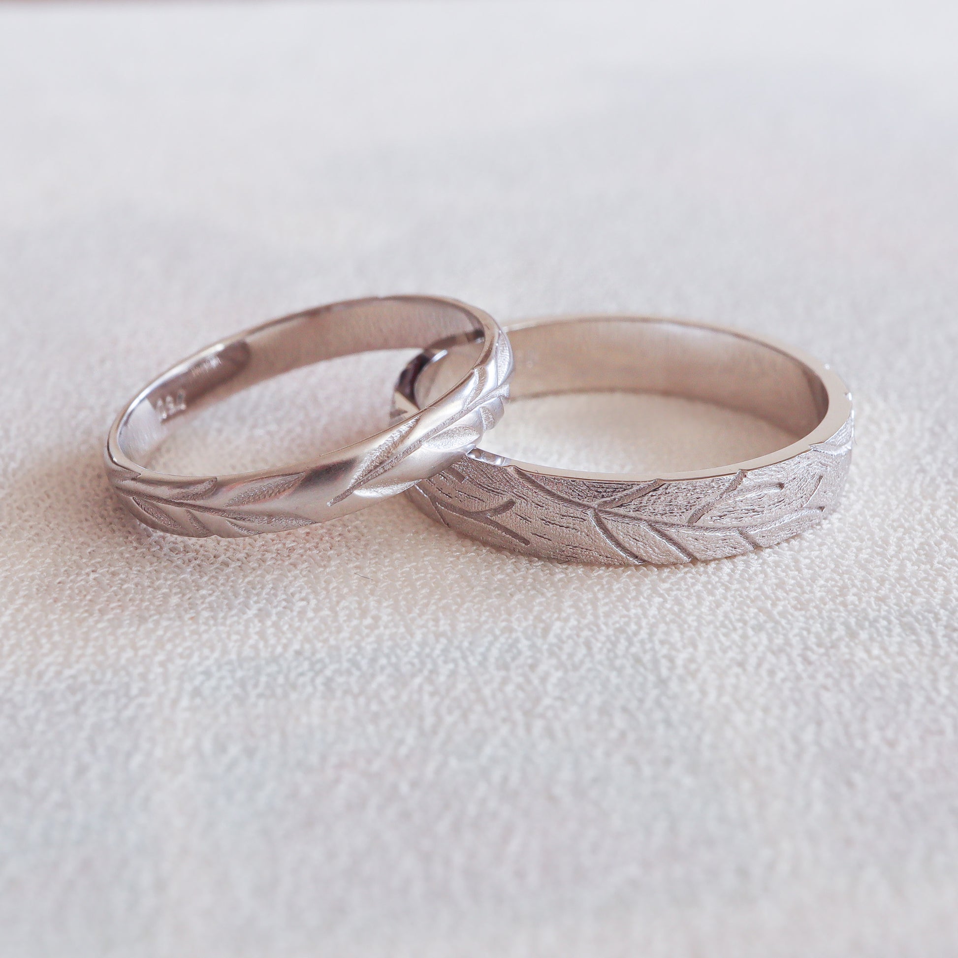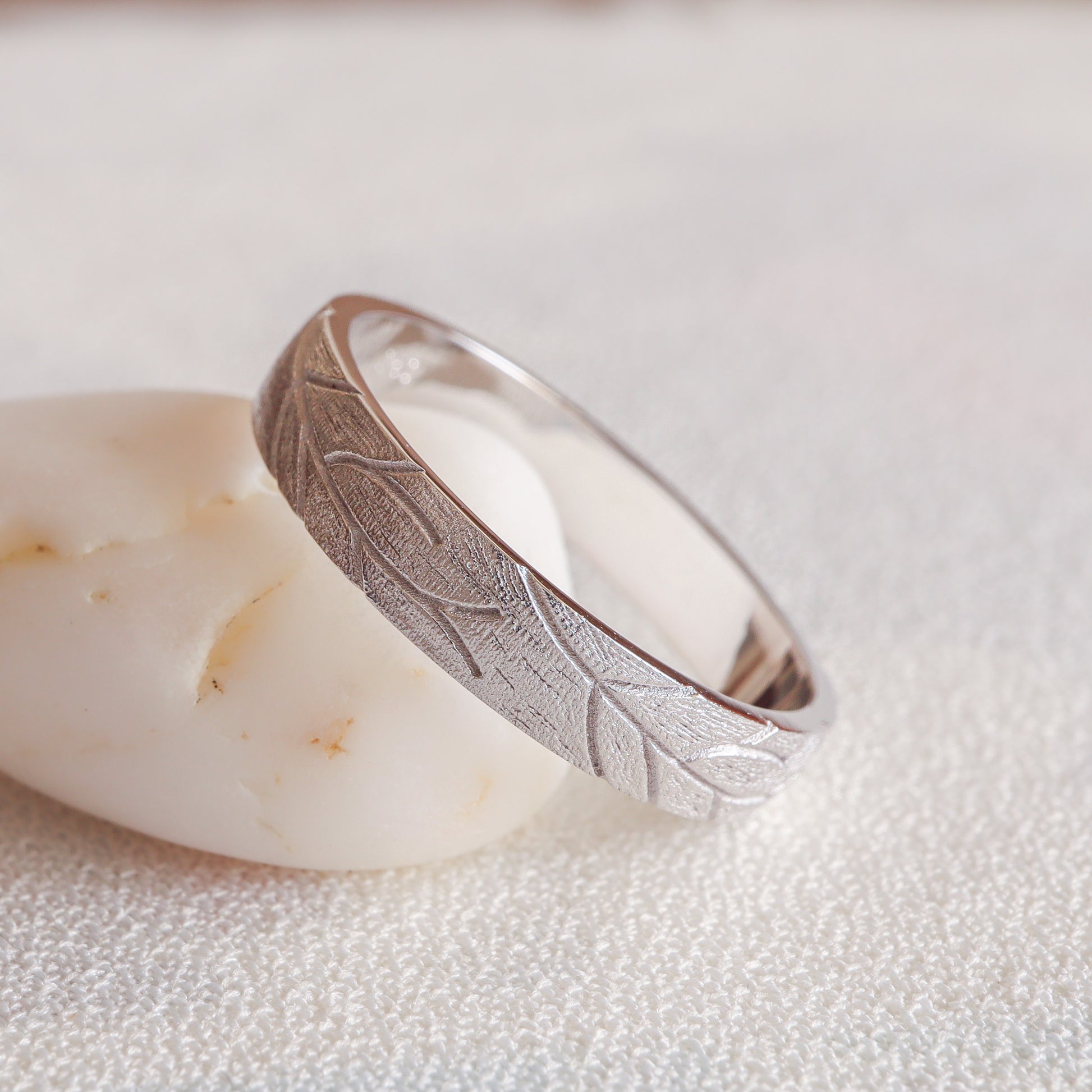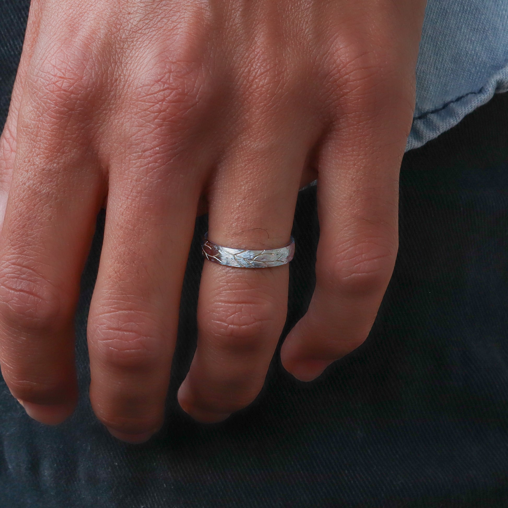 טבעת זהב לבן עם חריטות שורשים – סמל לקשר עמוק, יציב ונטוע באדמה.