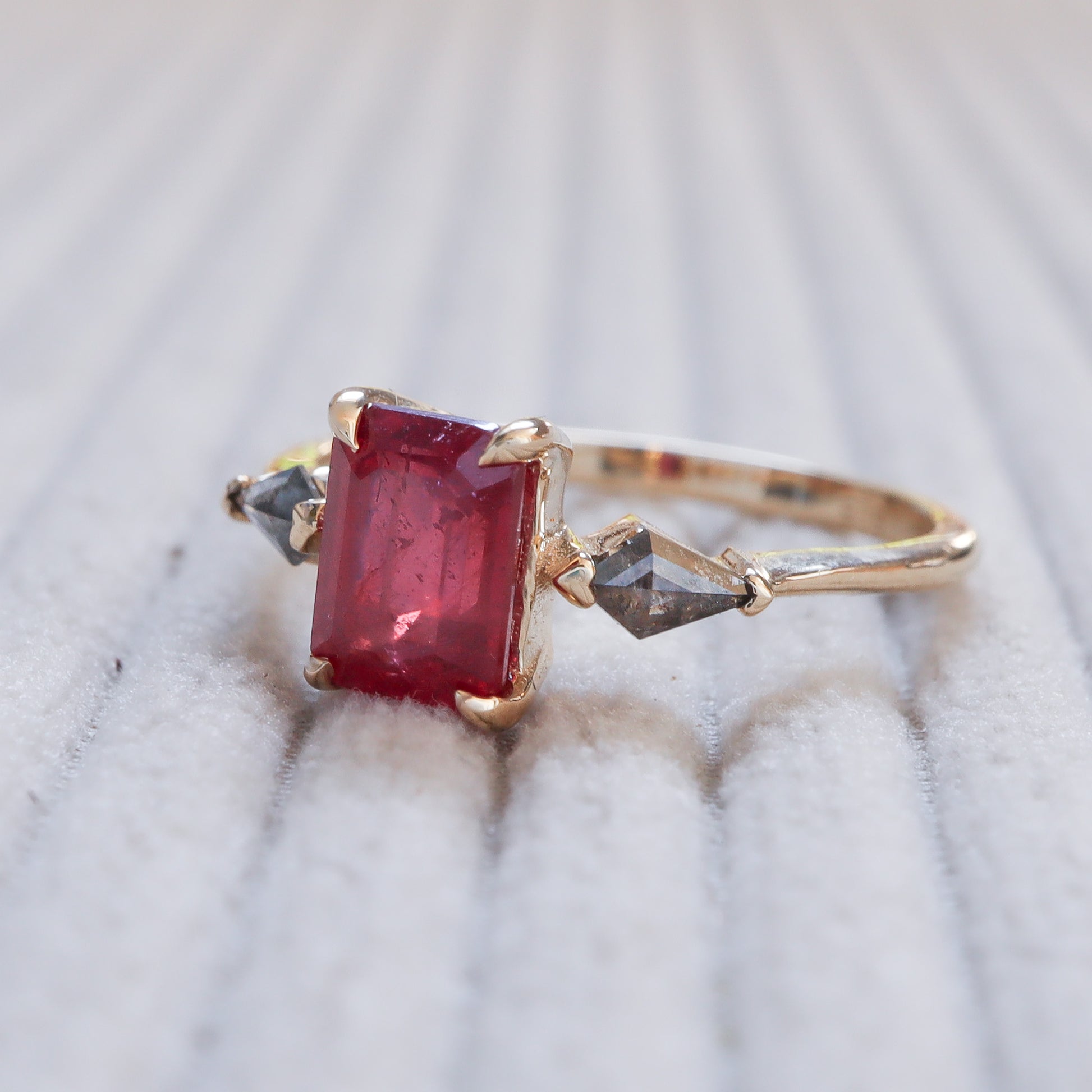 טבעת שלוש אבנים | רובי ויהלומים אפורים