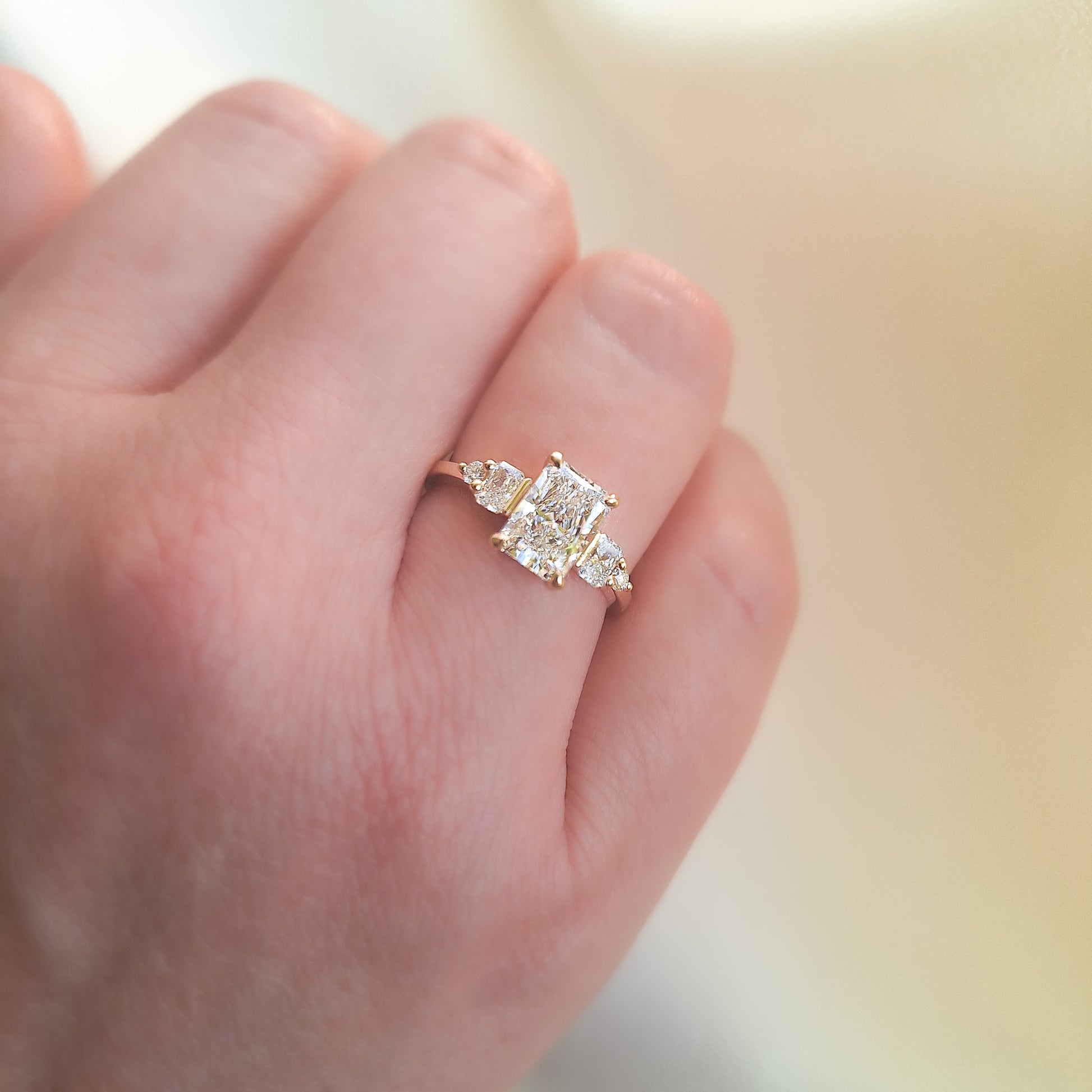 הכירו את טבעת הראיאנטים, מעוצבת בזהב עם שלושה יהלומים בחיתוך ראדיאנט שמהווים את מוקד העיצוב. במרכז, יהלום ראדיאנט גדול מוקף משני צידיו באבן ראדיאנט נוספת, ולצידם מונח יהלום עגול שמשלים את המראה בצורה מושלמת. העיצוב העדין והמתוחכם של הטבעת מבטיח שהיא תתאים לכל אירוע אלגנטי ותוסיף נגיעה של יוקרה לכל הופעה.
