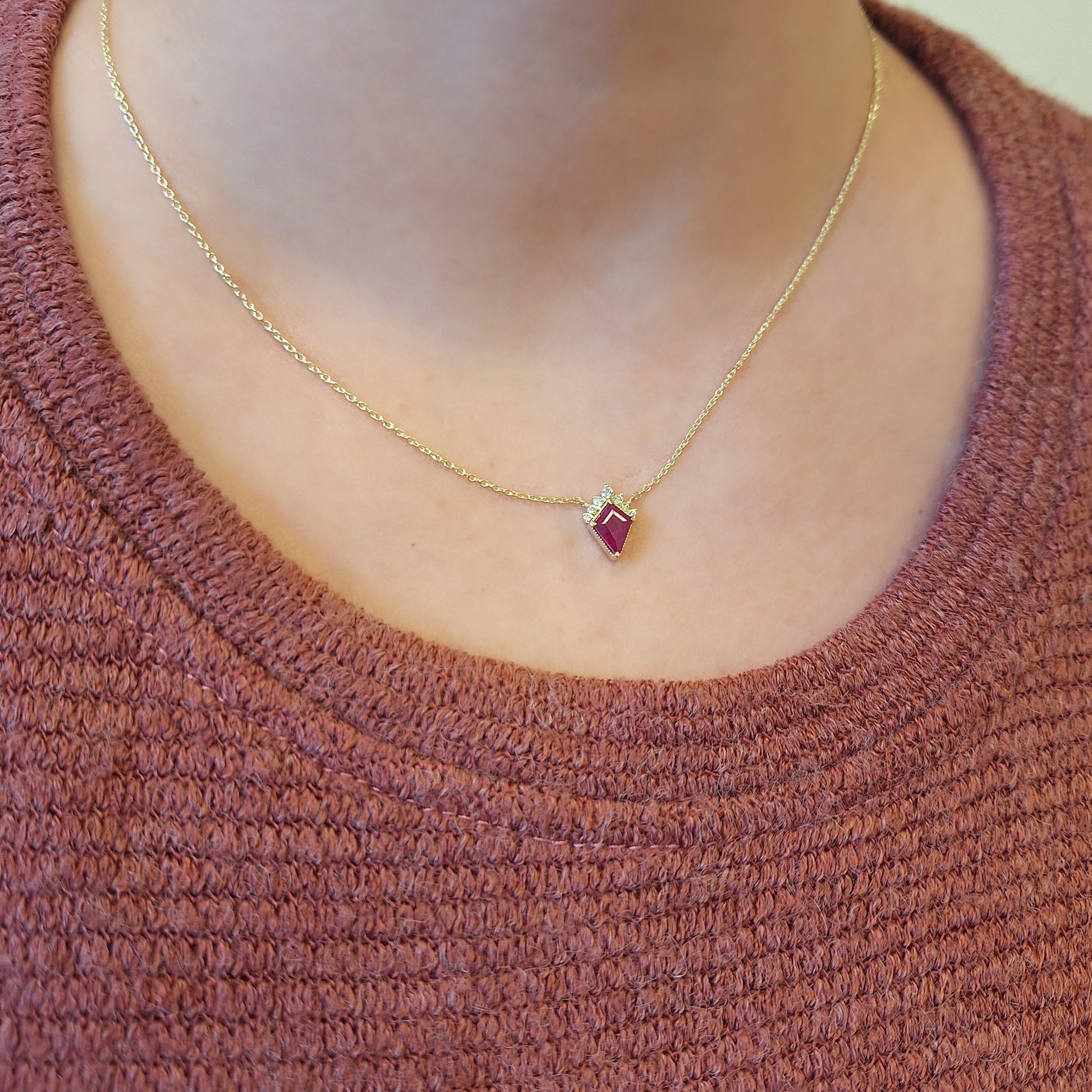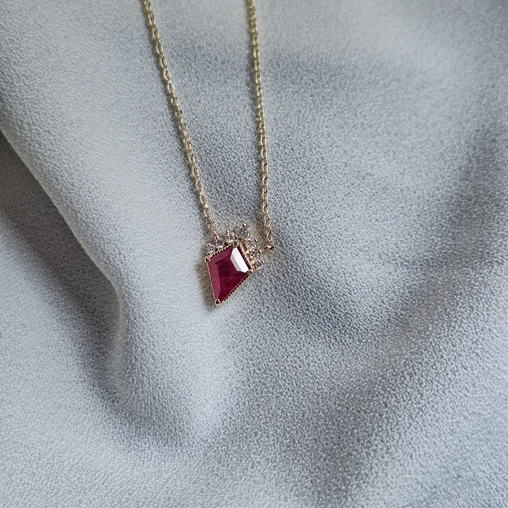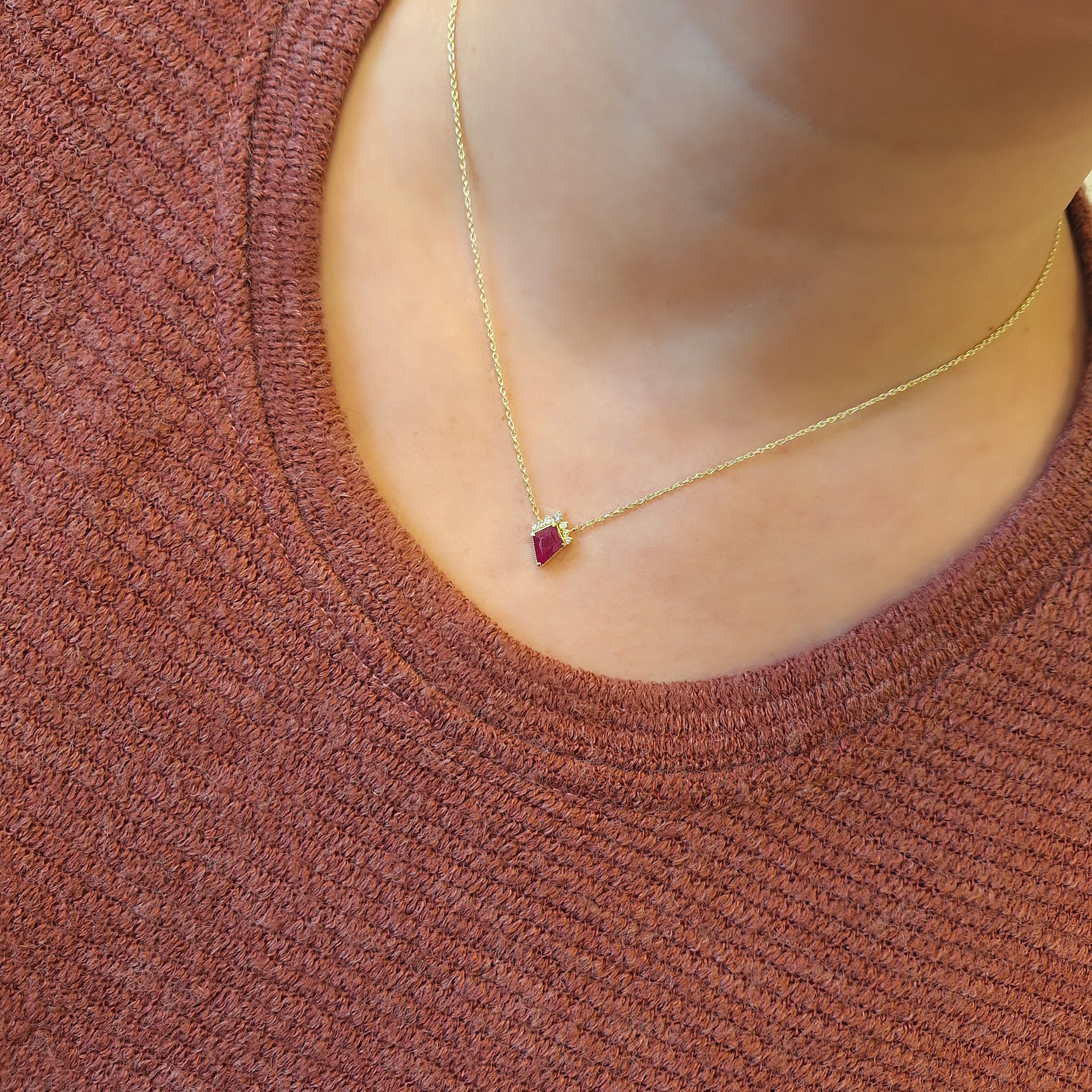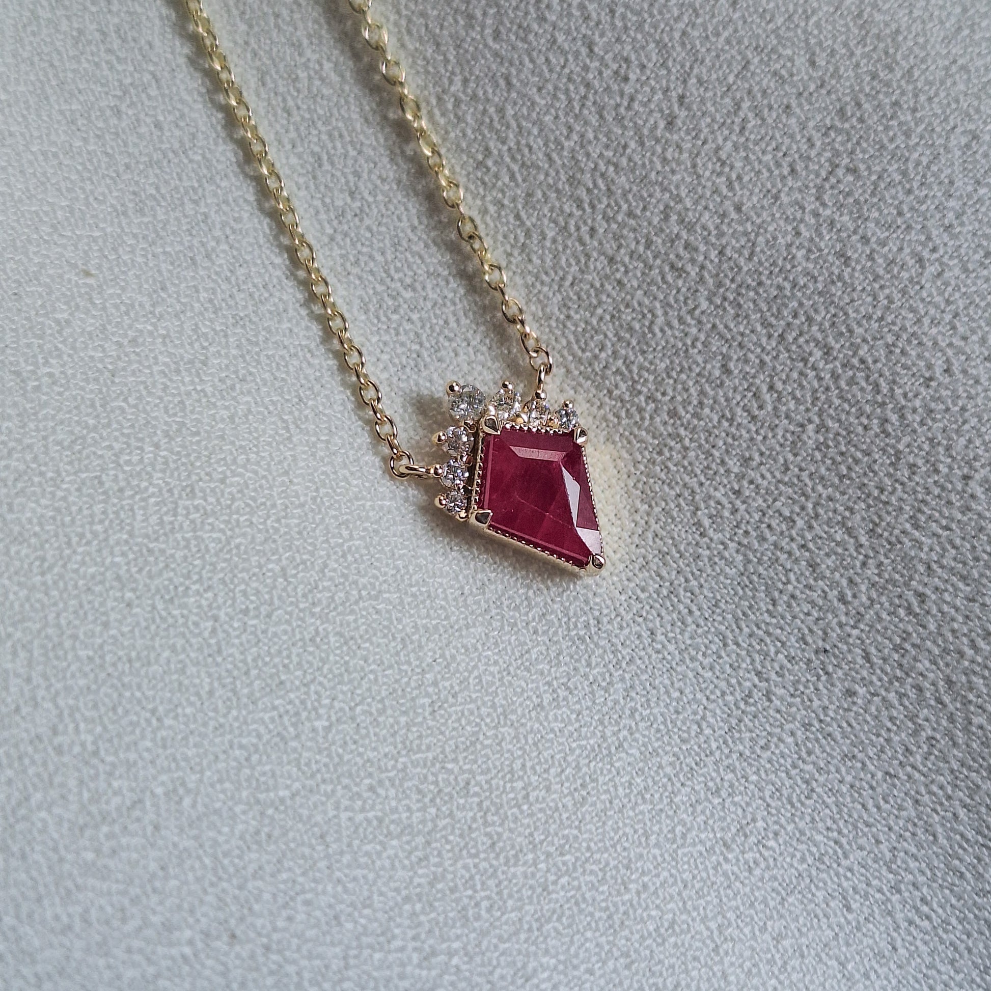 התליון הזה נולד מתוך רצון להדגיש את הניגוד שבין הדיוק של חיתוך הקייט (דלתון) לבין החספוס הטבעי של הרובי. מסגרת המילגריין (Milgrain) מסביב לאבן היא לא רק עיטור, היא מעניקה לזהב טקסטורה עשירה ומסגרת נוכחת שחוגגת את עבודת היד.