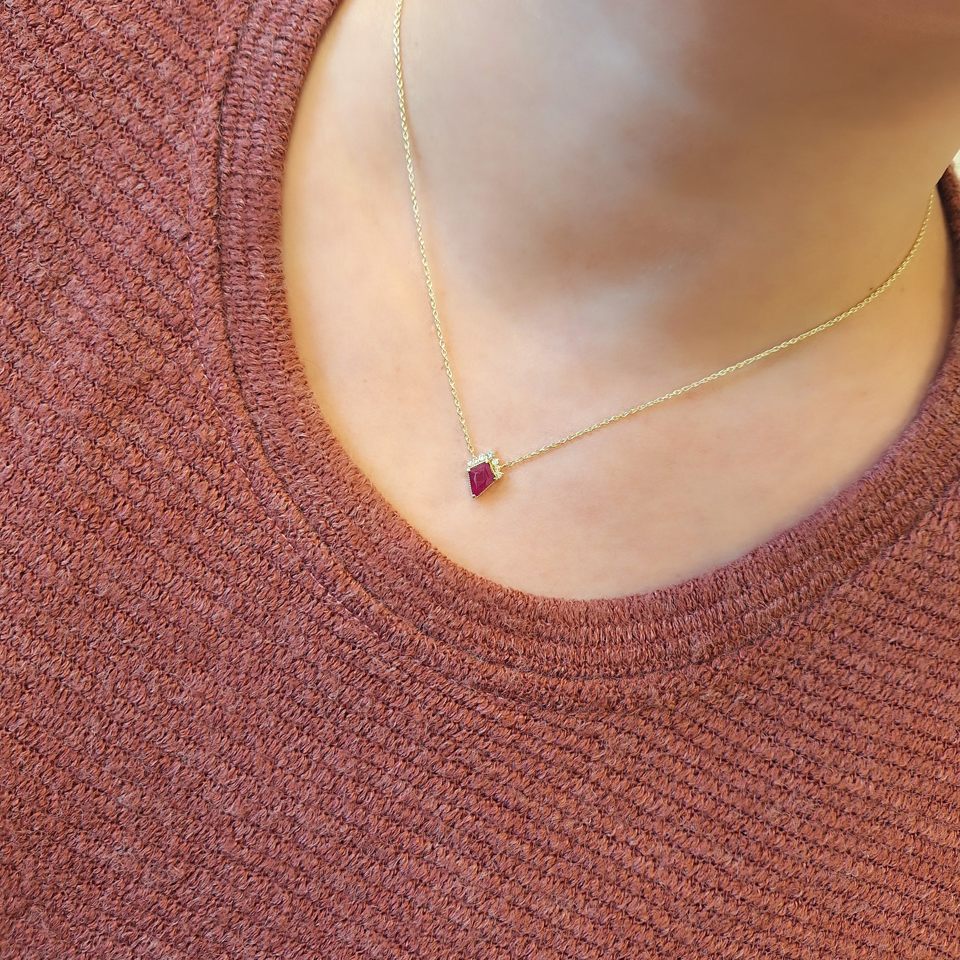 מעל האבן האדומה משובצים יהלומים לבנים העוקבים אחר הזוויות החדות של התליון. זהו סידור שמייצר משחקי אור בלתי פוסקים וניגודיות צבעונית חזקה, המעניקה לתכשיט נוכחות ויזואלית דומיננטית על הצוואר מבלי לאבד את הדיוק העיצובי שלו.