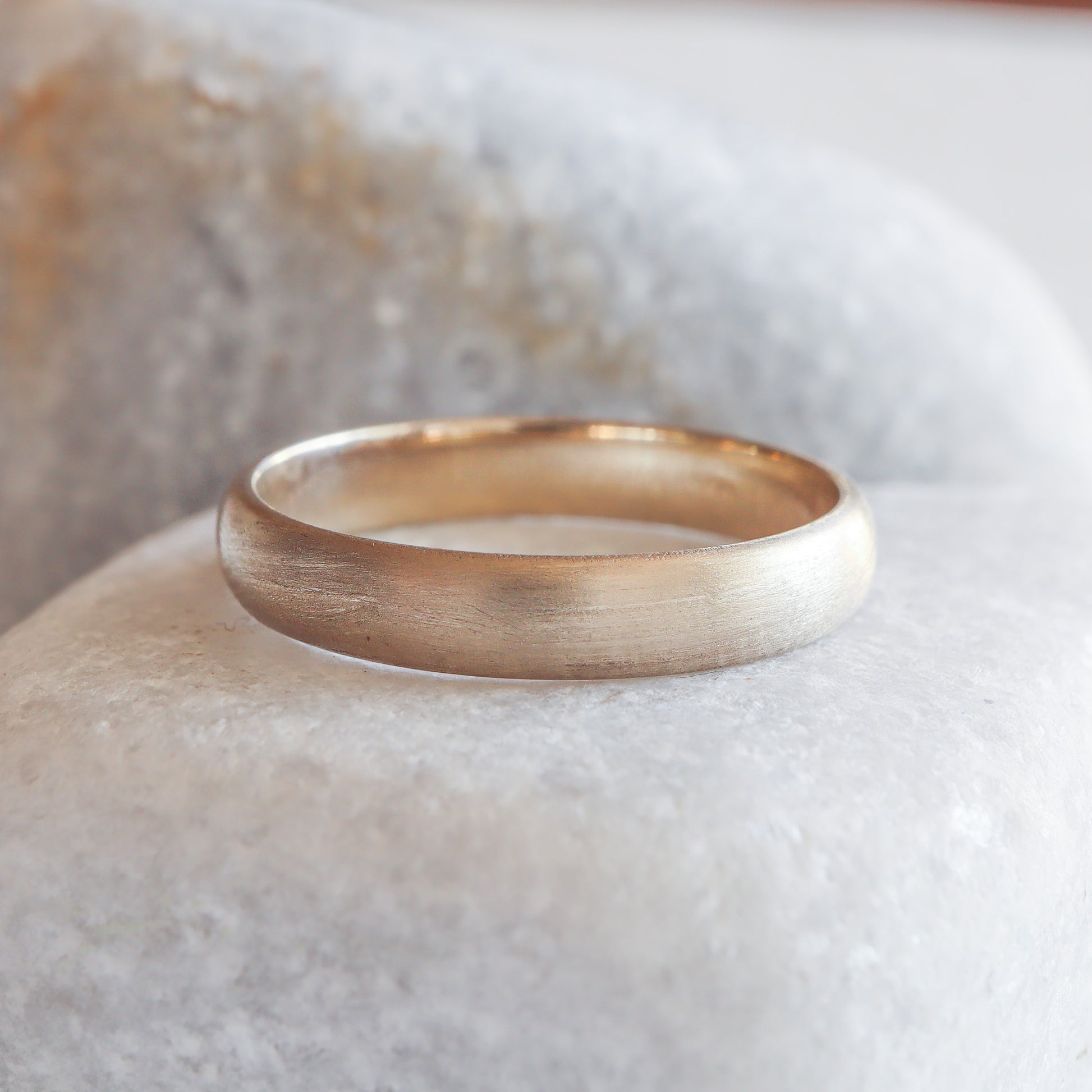 טבעת נישואין לגבר מזהב שמפניה – גוון אפור עד צהבהב. יצירת מופת של עיצוב כפרי ומחוספס! טבעת פשוטה אך מיוחדת מעוצבת בעבודת יד, בעלת גימור מוברש בסטייל גברי. מגיעה בזהב 14 או 18 קראט לפי בחירתך.