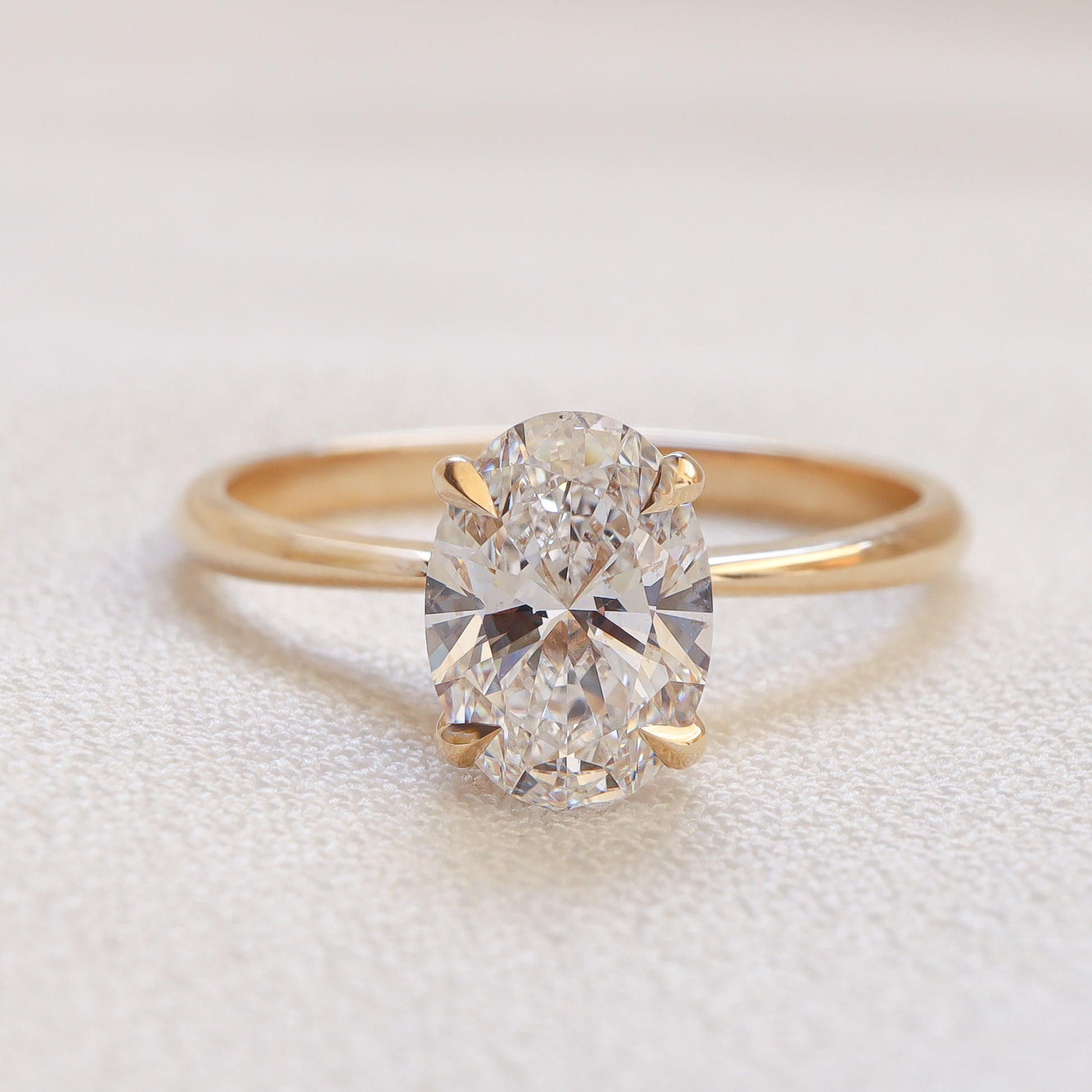הפגיני אלגנטיות על-זמנית עם טבעת אירוסין אובלית הכוללת יהלום בשיבוץ עדין של ארבע שיניים. טבעת סוליטייר עדינה עם הילה של יהלומי קטנים מתחת ליהלום המרכזי עיצוב קלאסי על זמני עם טוויסט עדין של ייחודיות.